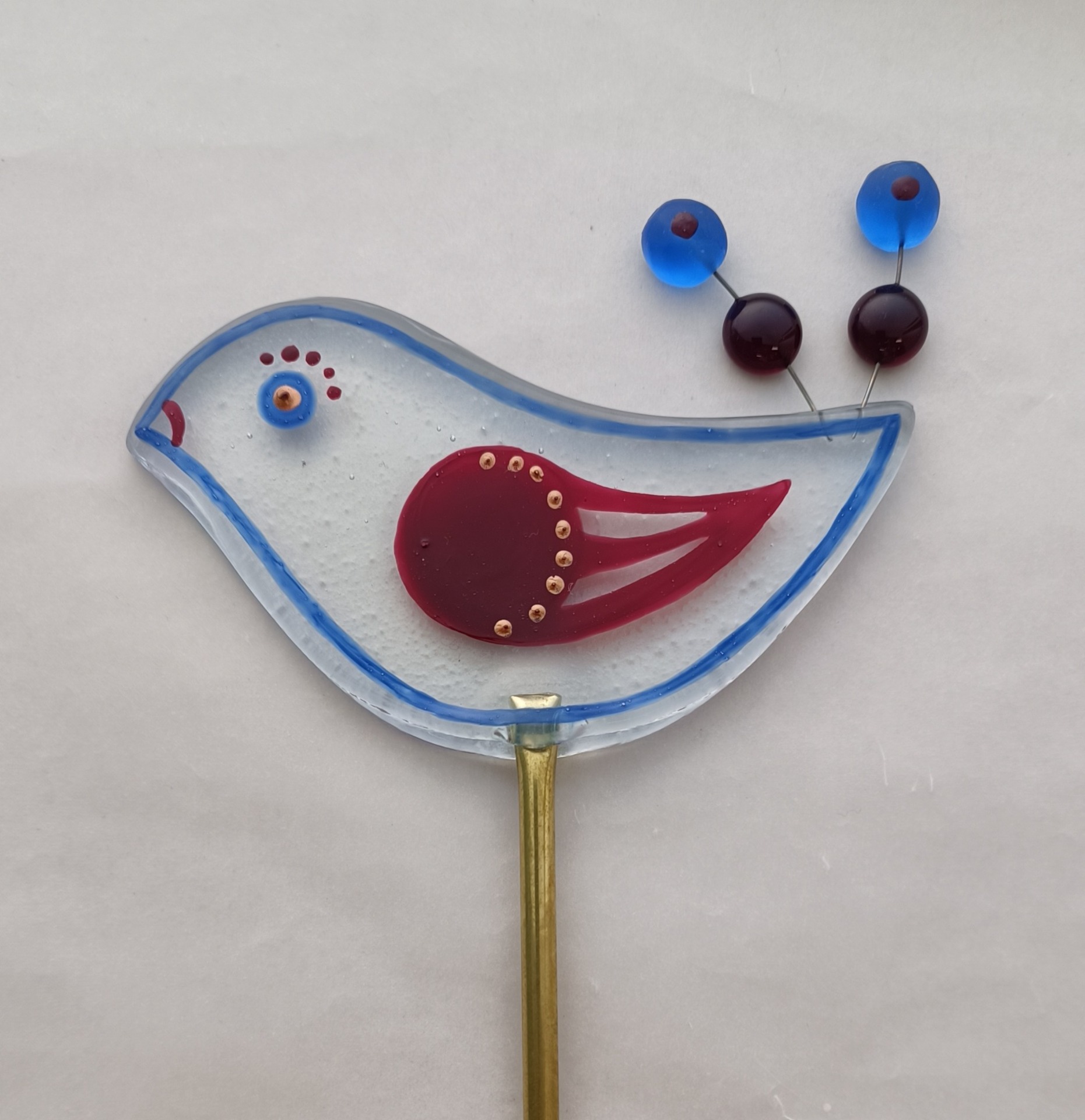 Délka tyčky 20 cm, ptáček je o rozměrech 10,5 x 6,5 cm.
